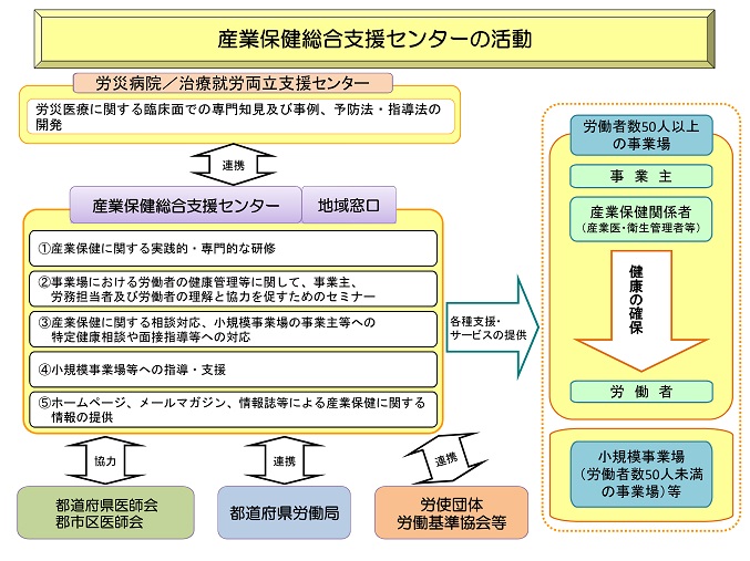 さらに、事業主からの相談内容や要望に応じて、産業保健総合支援センターや地域窓口の専門スタッフが直接事業場を訪問し、メンタルヘルス対策、作業環境管理、作業管理等状況に即した労働衛生管理の総合的な助言・指導を行っています。