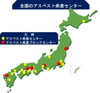 当機構では、従前からアスベスト(石綿)関連疾患に係る特殊健診、診断及び治療等に取り組んでまいりましたが、平成17年6月にアスベストばく露による健康問題が表面化し、政府の閣議決定(平成17年7月)に基づく「アスベスト問題への当面の対応」(アスベスト問題に関する関係閣僚会合とりまとめ)を受け、アスベスト関連疾患の診断・治療の中核となる医療機関として、22労災病院に「アスベスト疾患ブロックセンター」「アスベスト疾患センター」を設置し、産業保健総合支援センターとともに、積極的にアスベスト関連疾患への取組を実施しています。
